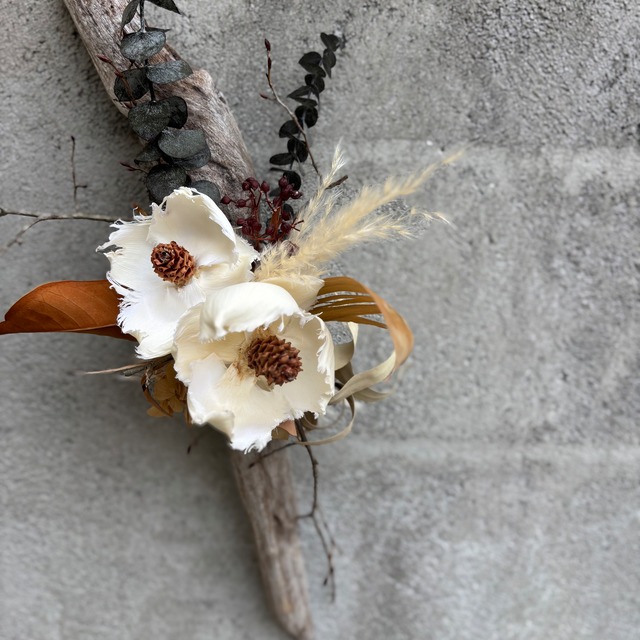 流木のスワッグ :流木をベースに白いパームフラワーやユーカリなどのドライを施したスワッグとなります。 :ユーカリが立体感をだし、アクセントの白の花、ふんわりとしたパンパスグラスが全体の温かみを与え、自然の美しさを際立たせております。 :壁に飾ることで、空間に落ち着きをもたらします。 SIZE… 高さ40cm(板29㎝)・幅27cm(板12㎝)・奥行16cm 流木の後ろに輪っかがあります。 そちらを引っ掛けて壁にお飾りください ※ご購入前にカートのある【ご購入前に必ずご覧ください】こちらをご覧ください。 ※天然素材を使用しているため、商品に個体差があります。 ※写真の光などにより、作品との色味や風合いが異なる場合があります。