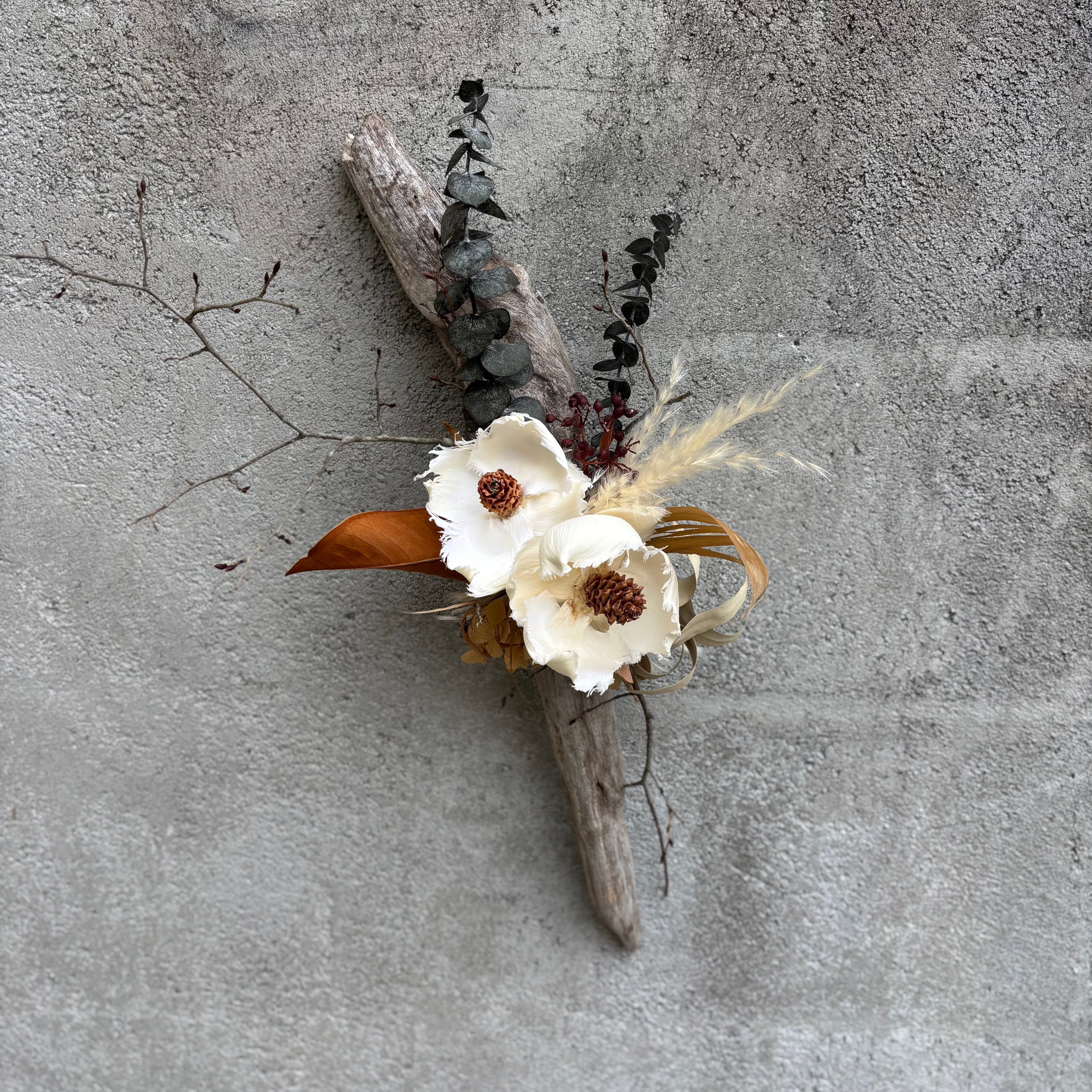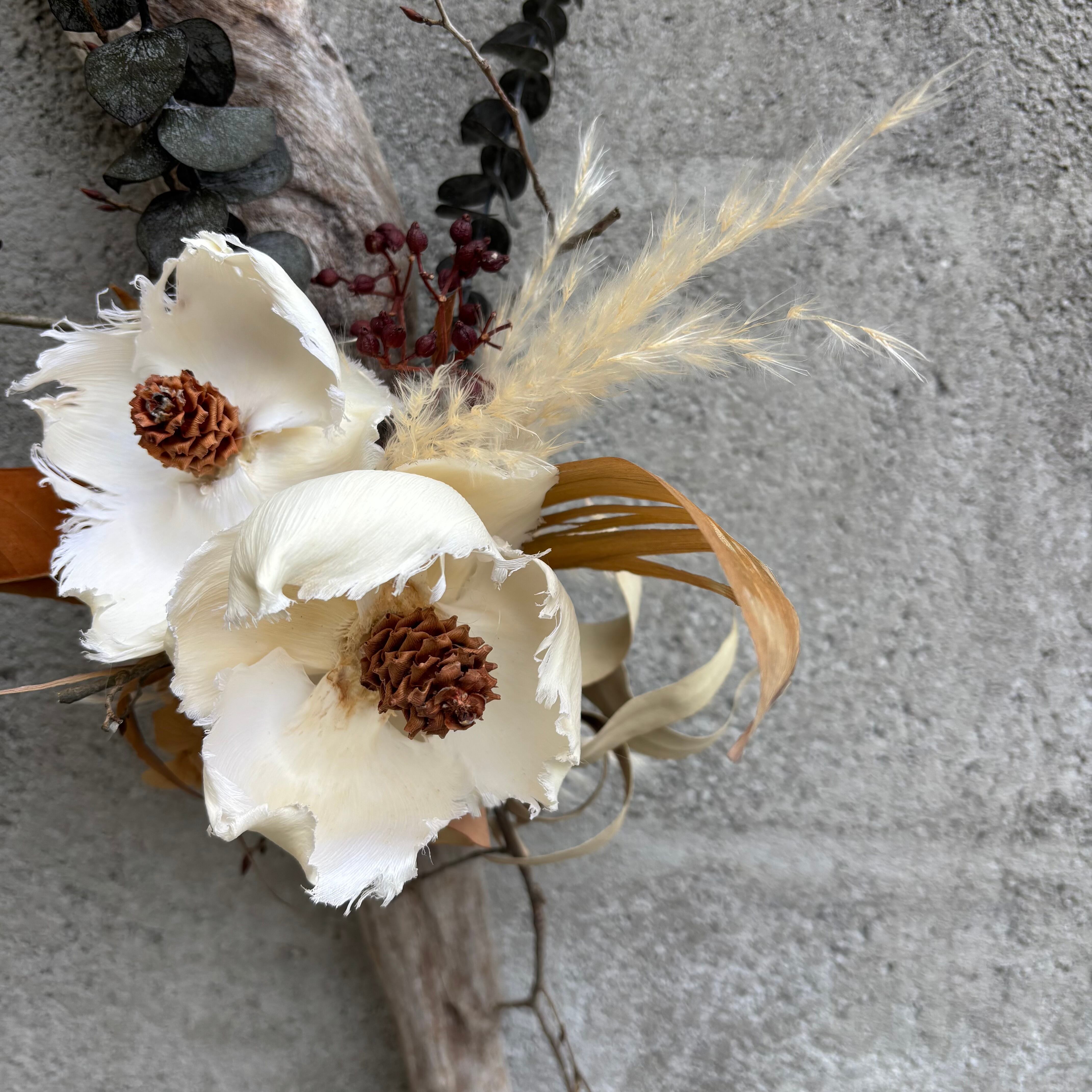 :流木をベースに白いパームフラワーやユーカリなどのドライを施したスワッグとなります。